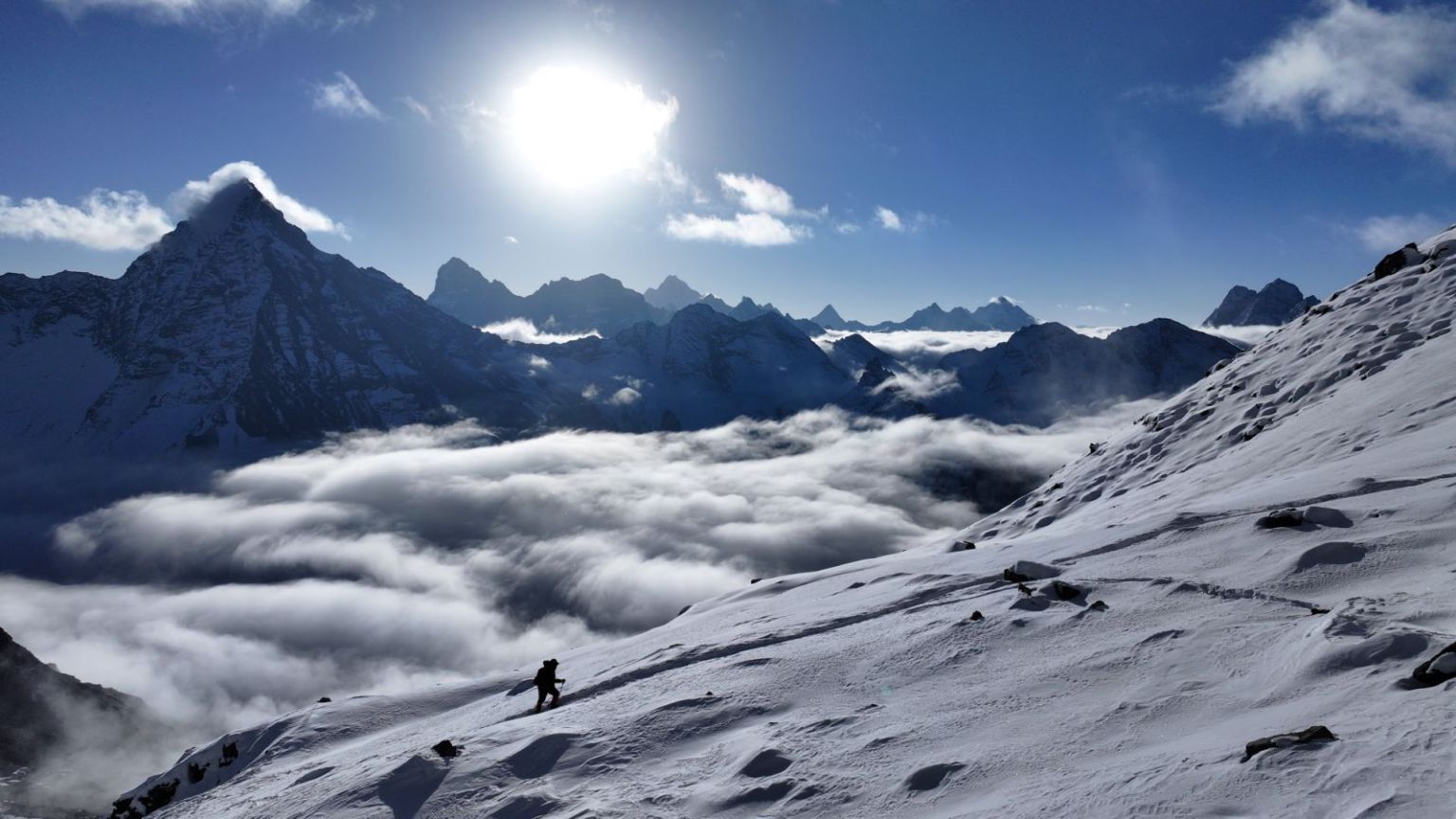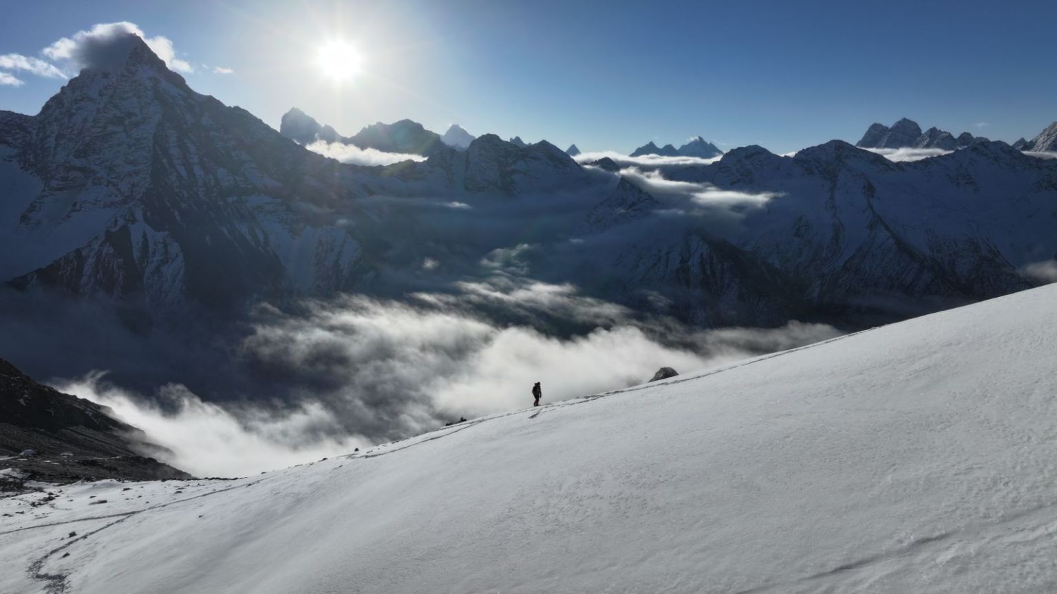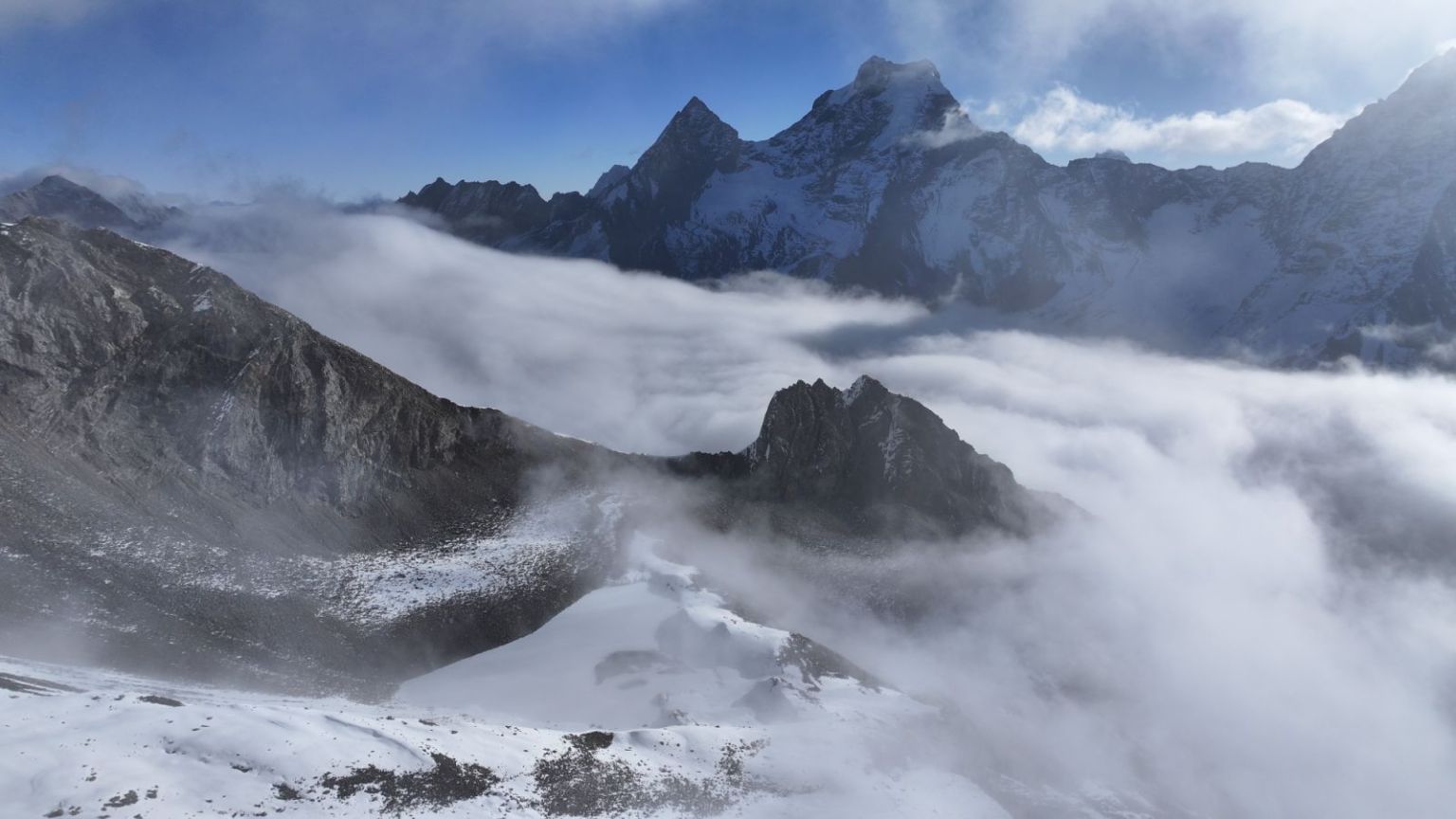 蔚蓝的天空覆盖一座浩瀚无垠的冰川威严矗立在眼前,蓝天中白云飘渺,游动着飘往远方,山裹着银色的纱帘,,层峦叠嶂,此起彼伏,像极了洁白无瑕工艺复杂的新娘的嫁衣,脚下的雪在阳光的反射下发出刺眼的光芒。