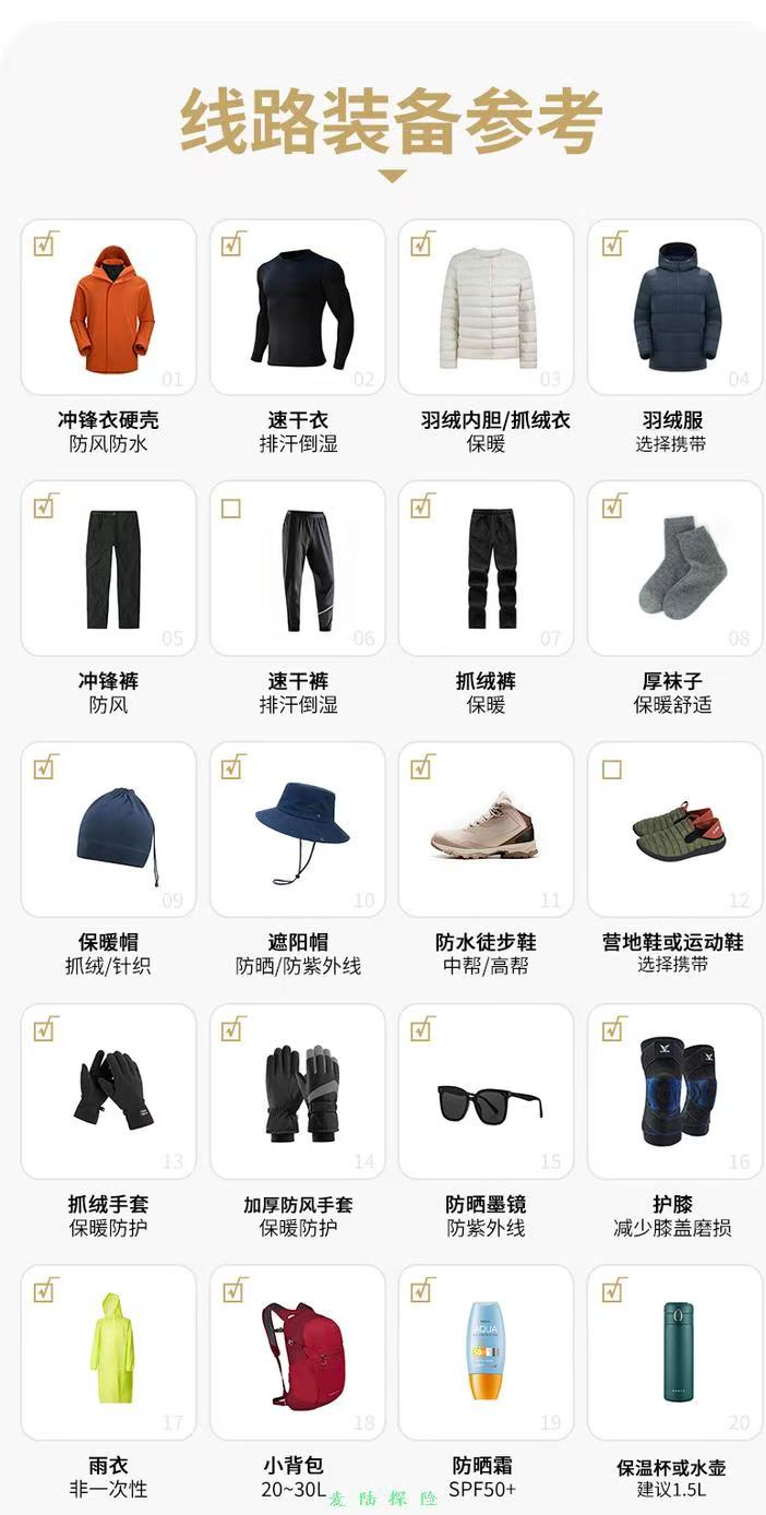 ①必备物品:墨镜、冲锋衣、抓绒、羽绒服、排汗体恤、冲锋裤、一顿路餐、袜子、登山鞋、保温杯、大背包(45L以上)、小背包(30L)、帽子(保暖帽、遮阳帽)、防晒霜、手套、排汗裤