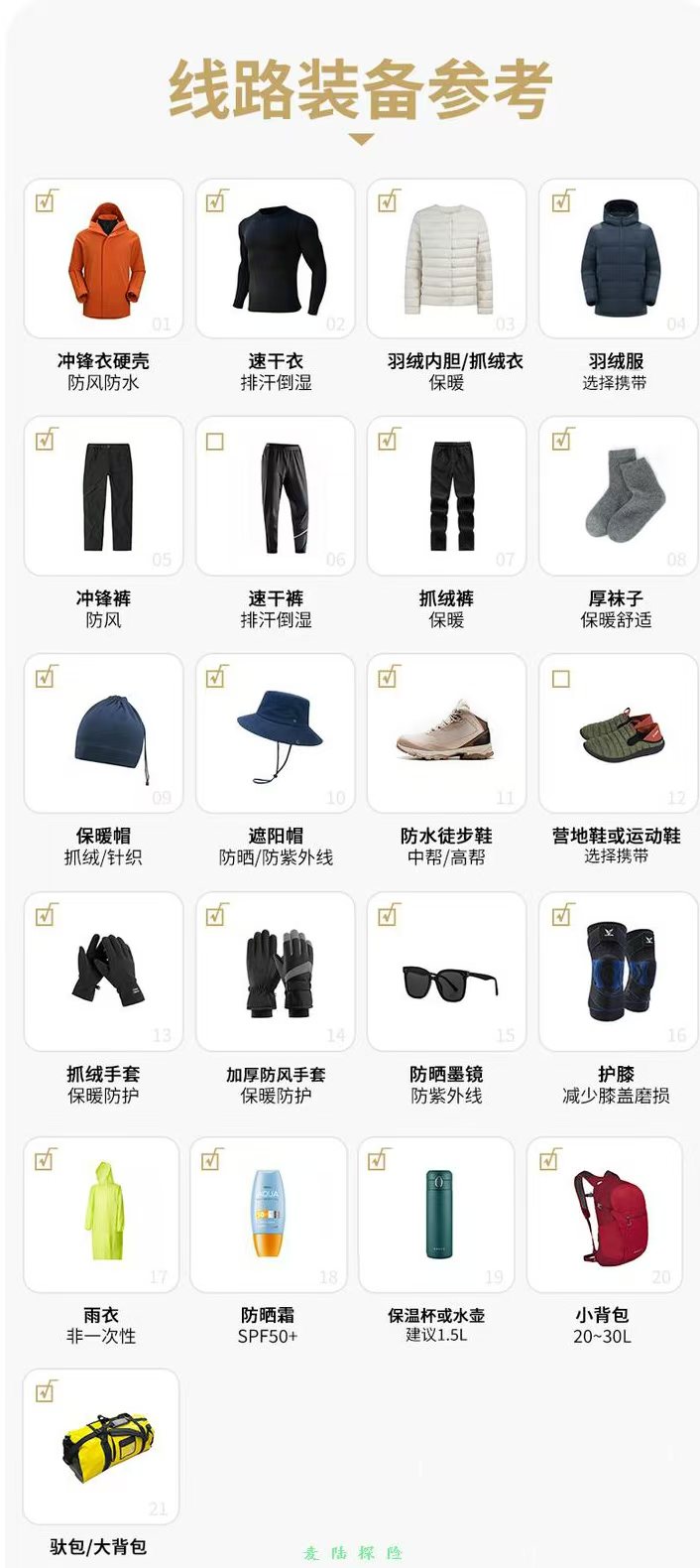 ①必备物品:墨镜、冲锋衣、抓绒、羽绒服、排汗体恤、冲锋裤、一顿路餐、袜子、登山鞋、保温杯、大背包(45L以上)、小背包(30L)、帽子(保暖帽、遮阳帽)、防晒霜、手套、排汗裤