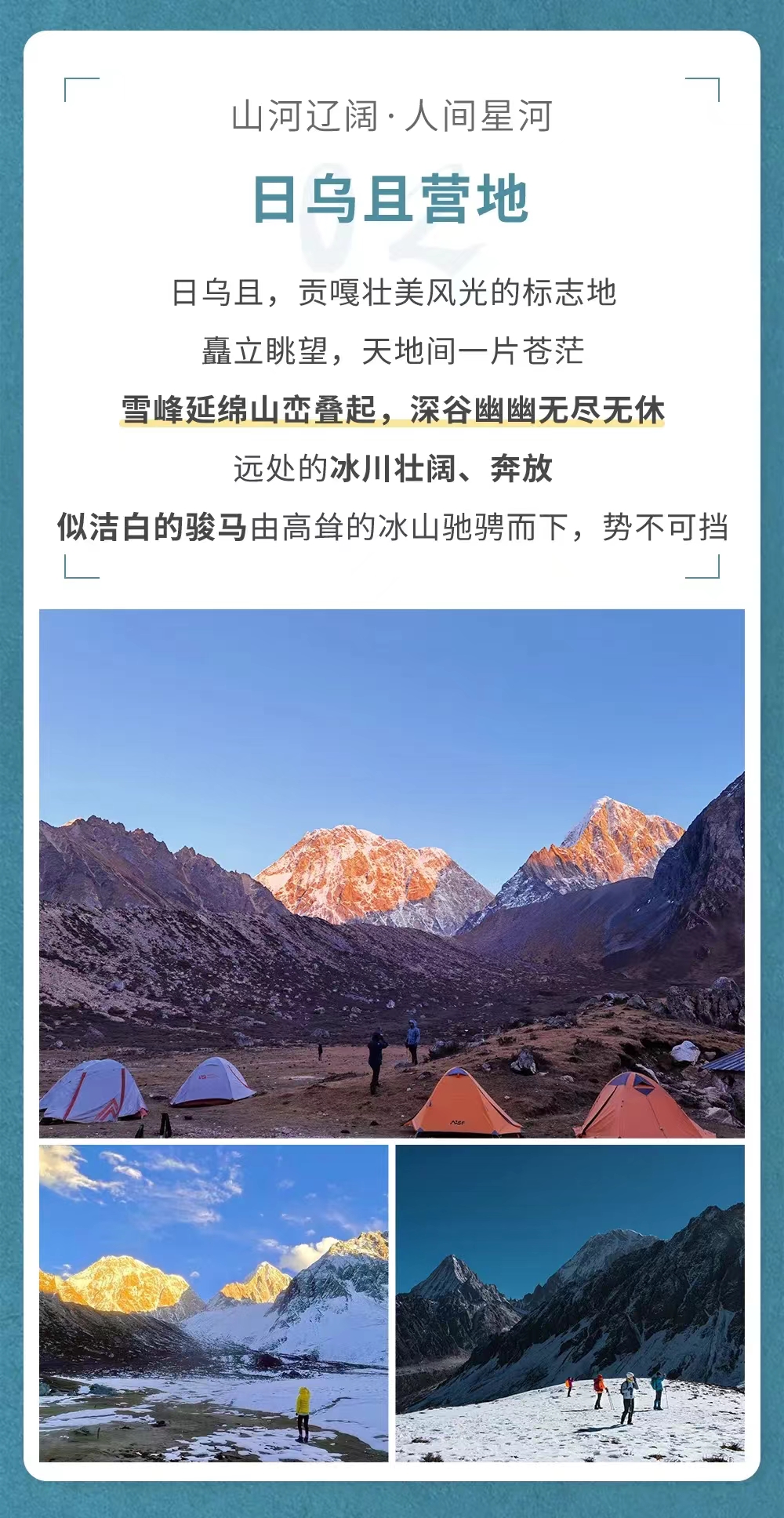 (1)全程徒步约37公里,单日最高爬升950米,徒步最高海拔为勒多曼因冰川4550米左右,住宿最高海拔为上日乌且营地4350米左右。
