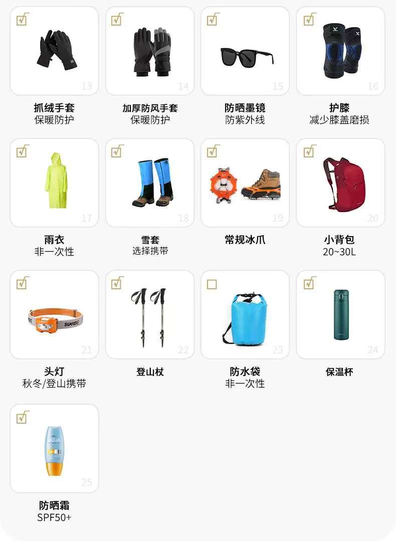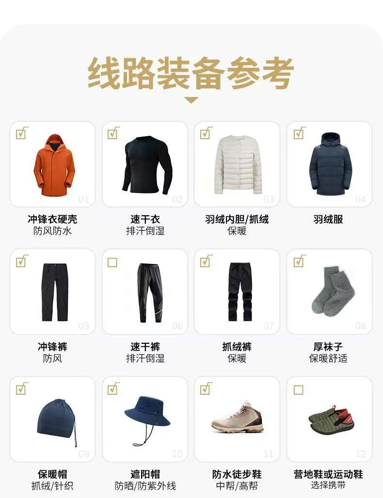 、背包、羽绒睡袋(舒适温度-10度左右)(我们会提供,小伙伴也可以自带、排汗衣、冲锋衣裤、抓绒衣裤、羽绒服、帽子、墨镜、手套、头巾(赠送)、登山杖(可提供)、水壶(1L)、中高帮防水徒步鞋、雪套、长袜多双、防晒霜、唇膏、个人药品、头灯、个人餐具、洗漱用品、雨具。