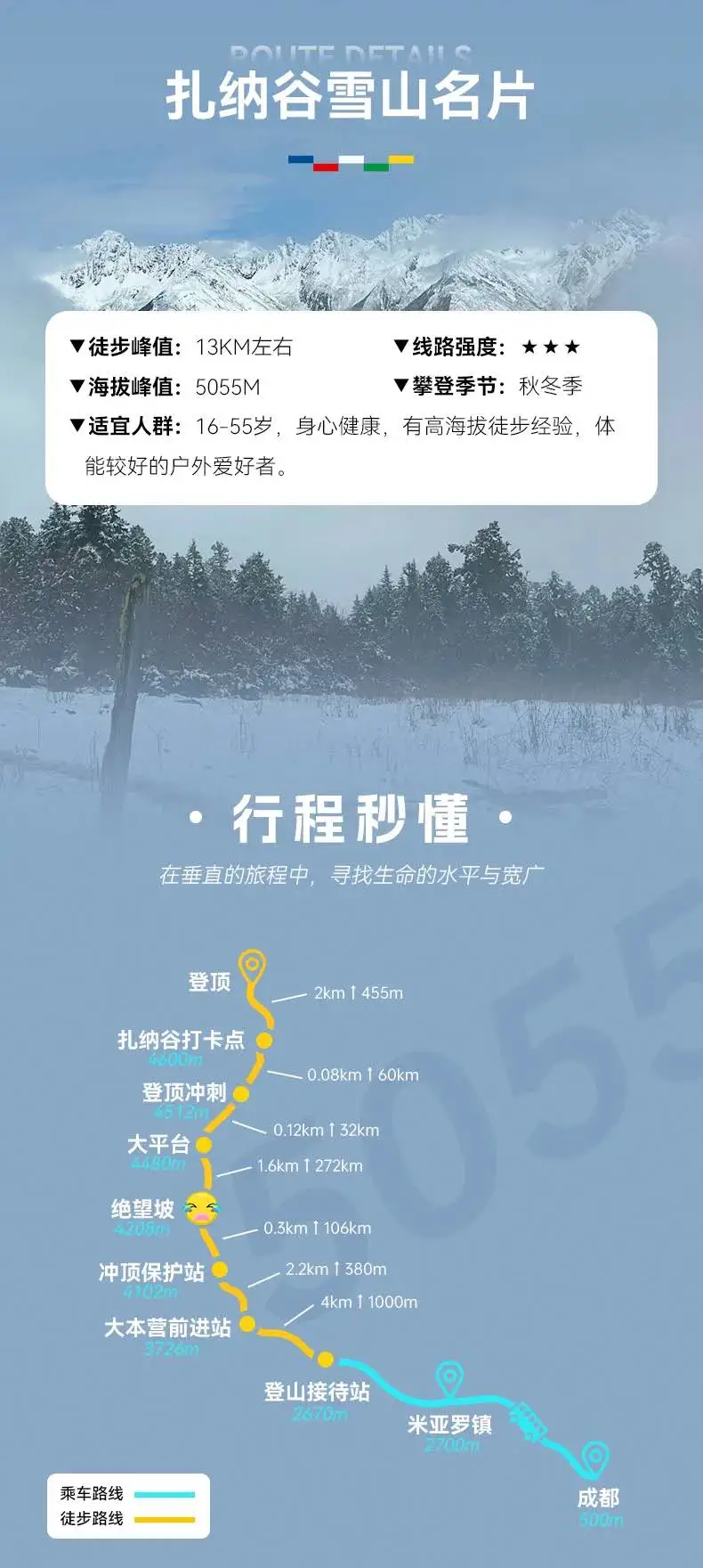 ▷ 海拔:扎纳谷打卡点4700M;登顶5055M;登山接待站2670M