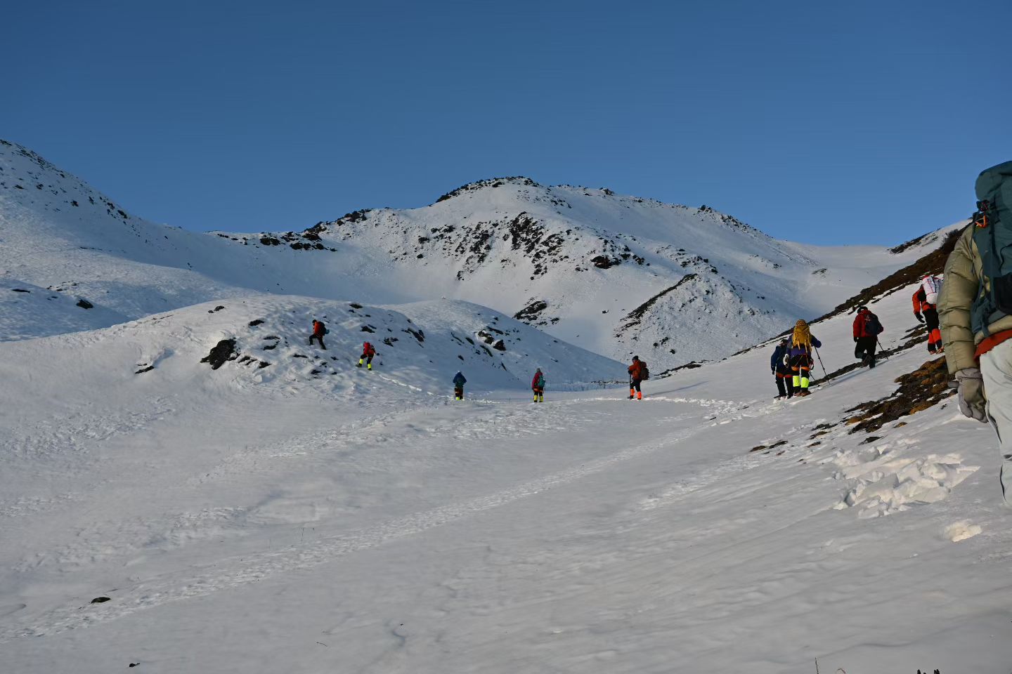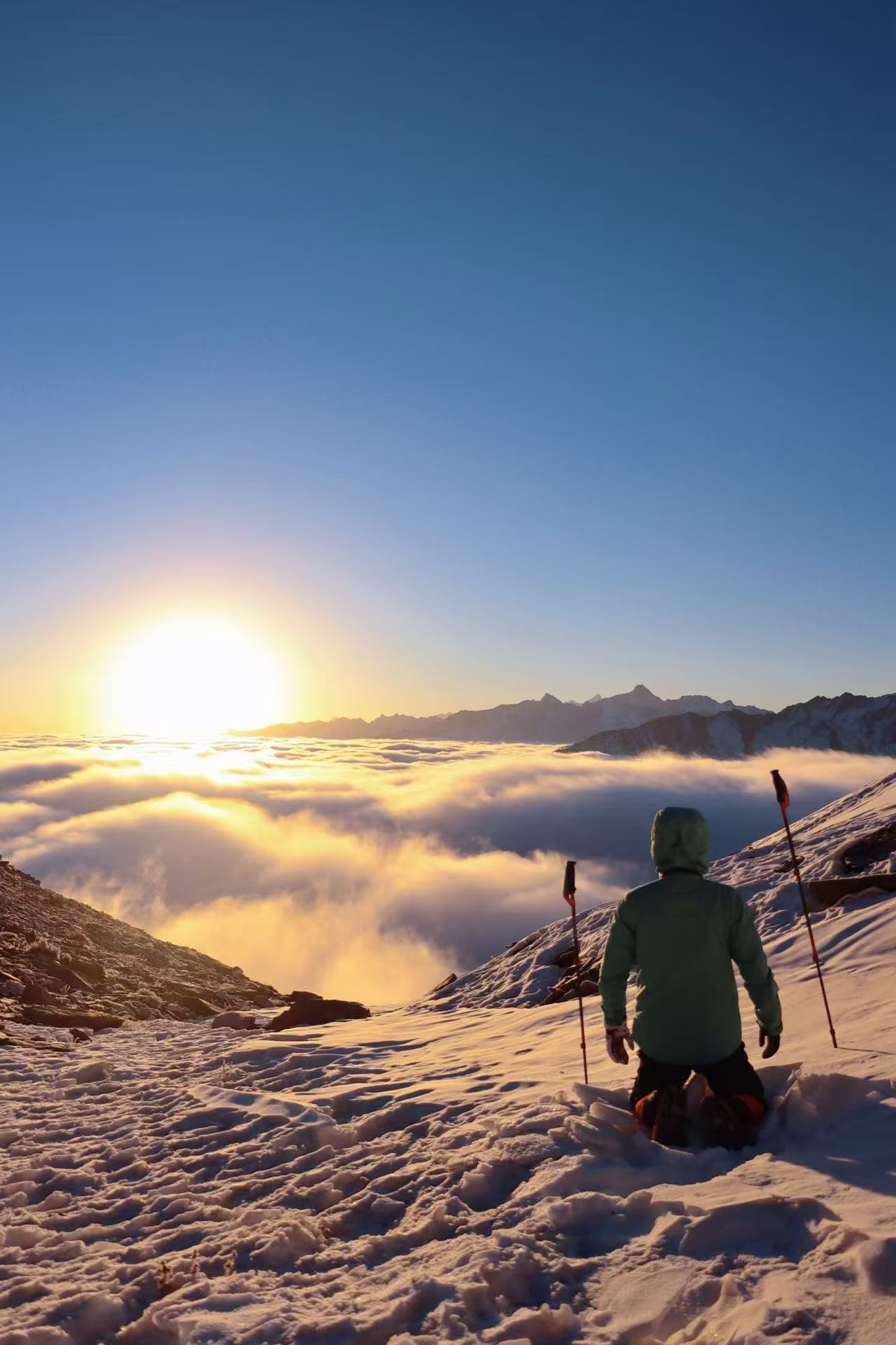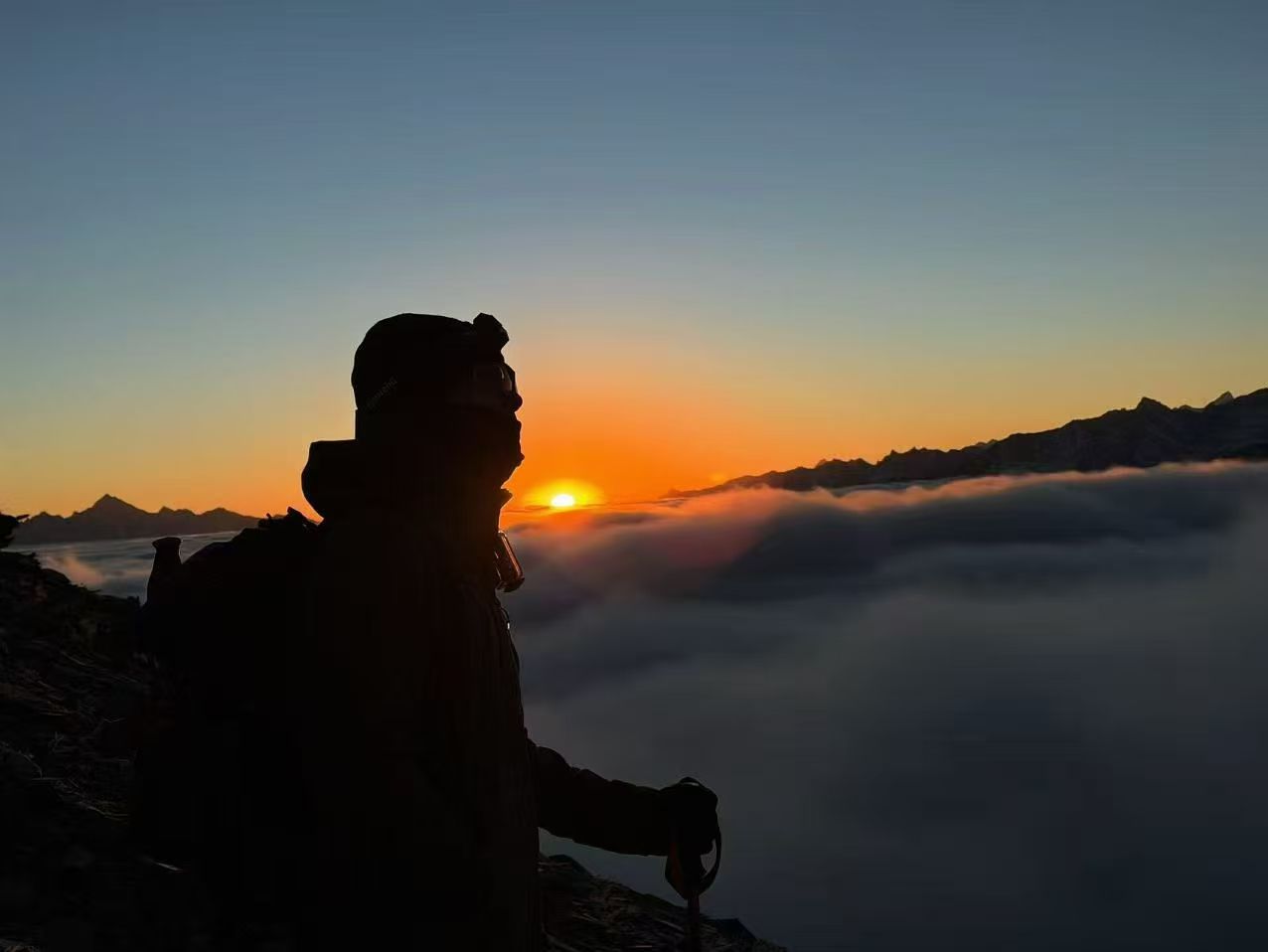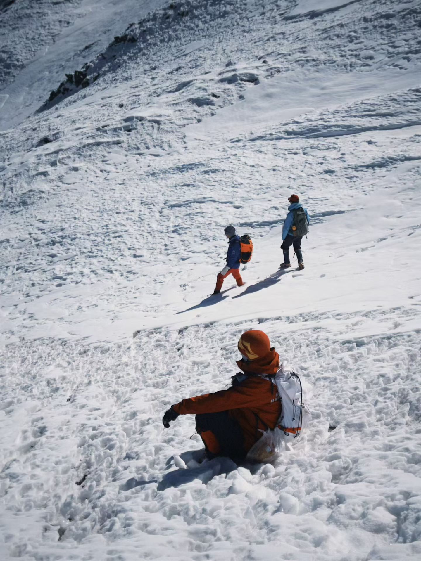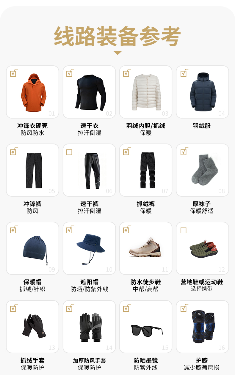 ①必备物品:墨镜、冲锋衣、抓绒、羽绒服、排汗体恤、冲锋裤、一顿路餐、袜子、登山鞋、保温杯、大背包(45L以上)、小背包(30L)、帽子(保暖帽、遮阳帽)、防晒霜、手套、排汗裤